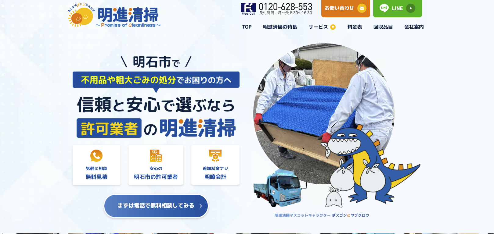 明石市で不用品回収や粗大ごみ処分や不用品回収、粗大ごみの回収・処分、遺品整理、ゴミ屋敷清掃、家具の回収・処分、家電の回収・処分の幅広いサービスに対応しています。明石市で信頼と安心で選ぶなら許可業者の明進清掃にお気軽にご相談ください。