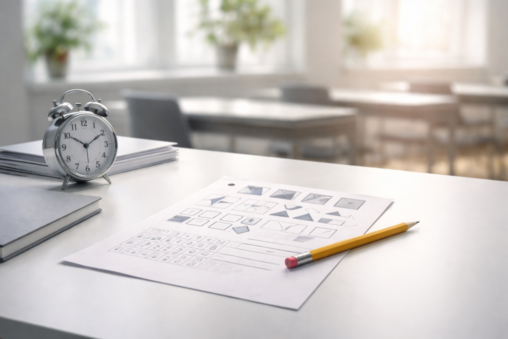メンサテストは図形問題が中心です。言語問題は限定的で、文字知識よりパターン認識能力が重視されます。暗記型の勉強で対応するテストではありません。試験は制限時間内に解答します。正答率だけでなく処理速度も評価対象になりやすい構造です。長時間じっくり考えるより、素早く規則性を見抜く力が求められます。